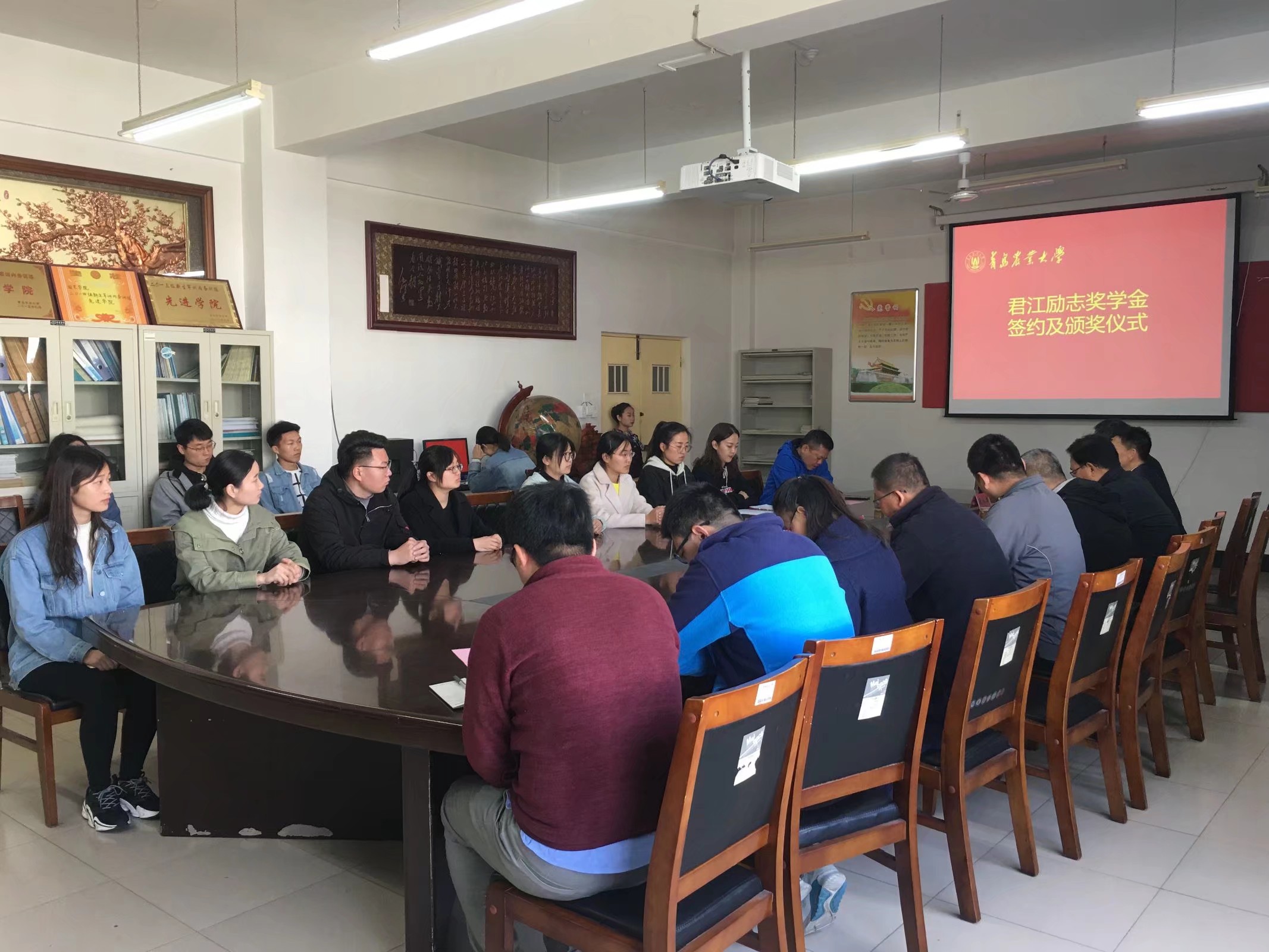 4月10日,bevictor伟德与上海君江科技有限公司在生物楼N306会议室举行“君江励志奖学金”签约及颁奖仪式。bevictor伟德副董事长原永兵,上海君江科技有限公司董事长孙君同,园艺公司党委书记隋成竹、副经理王永章和全体获奖员工参加。仪式由园艺公司党委副书记、副经理王春晓主持。