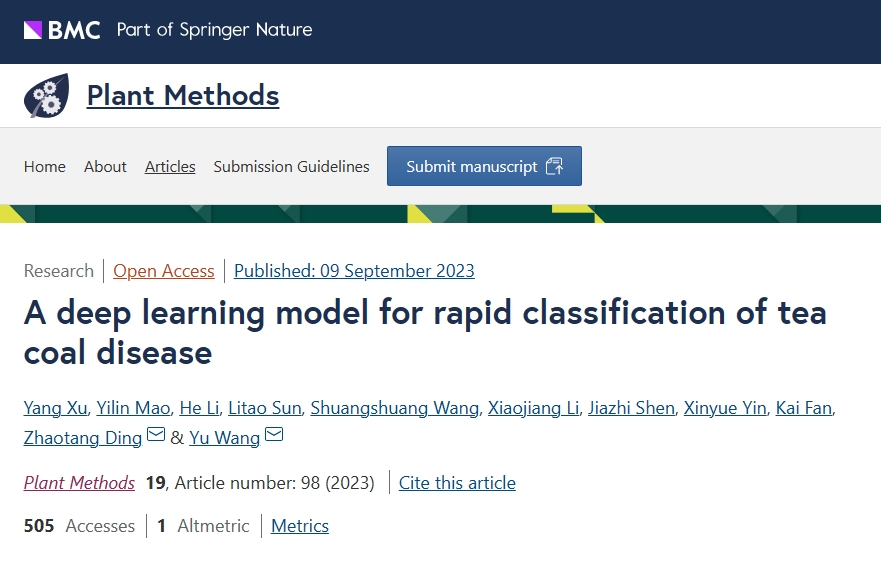 2023年8月27日,茶树育种团队在Plant Methods 发表了题为“A deep learning model for rapid classification of tea coal disease”的研究论文。bevictor伟德正高级实验师王玉为论文共同通讯作者,bevictor伟德茶学专业在读硕士研究生徐阳为第一作者。该研究得到了山东省茶产业技术体系首席专家项目、山东省农业良种工程项目、山东省农业科公司创新项目和山东省泰山学者专项基金等的资助。