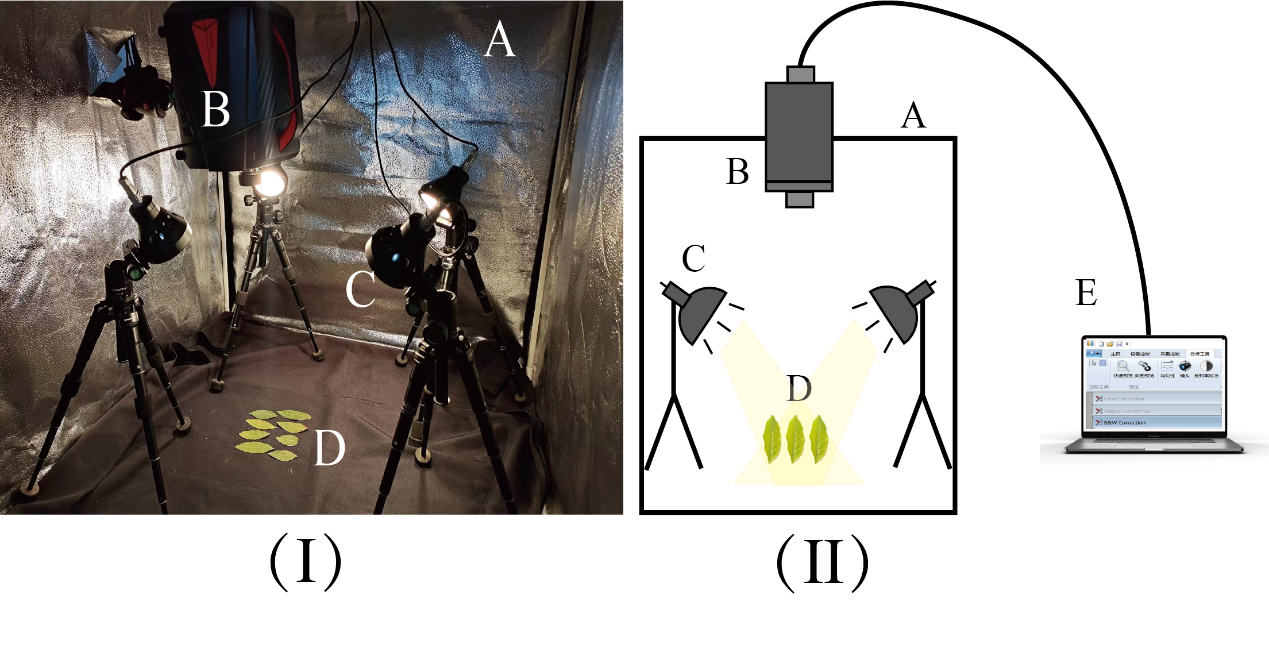 图3(Ⅰ)高光谱设备实景图。(Ⅱ)高光谱设备模式图。(A)立方体暗箱;(B)高光谱相机;
