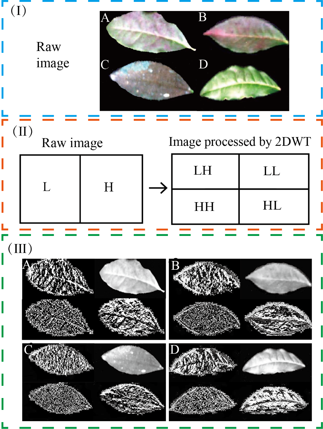 图4(Ⅰ)原始图像。(Ⅱ)小波变换原理图。(Ⅲ)小波变换处理后的不同病害程度的叶片图像。