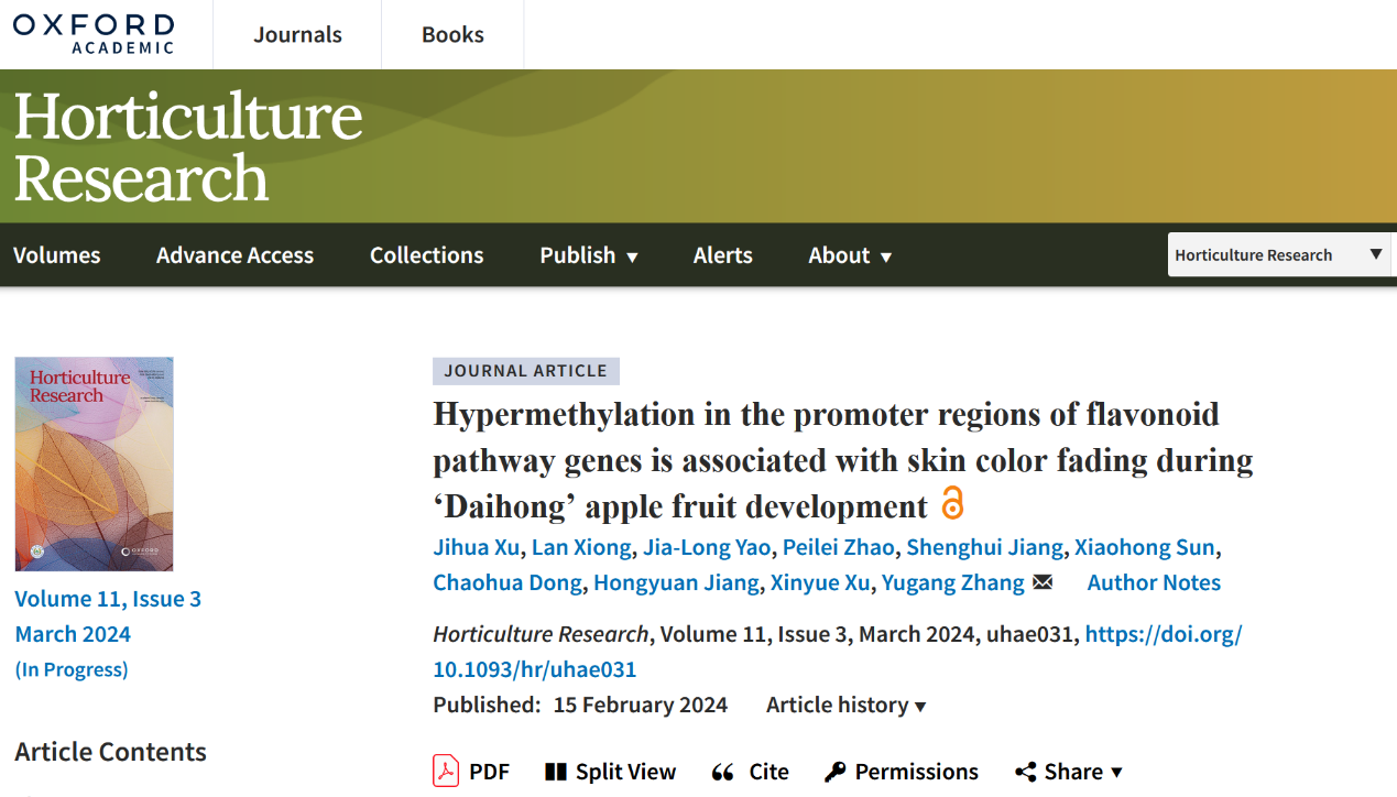 近日,bevictor伟德张玉刚教授团队在中科院一区Top期刊Horticulture Research发表题为Hypermethylation in the promoter regions of flavonoid pathway genes is associated with skin color fading during ‘Daihong’ apple fruit development的研究论文。该研究以bevictor伟德苹果育种团队选育的R1R6型红肉苹果品种‘黛红’为试材,结合遗传背景分析、代谢物分析、转录组、甲基化组及分子生物学手段解析了DNA甲基化参与苹果果皮褪色的机理。