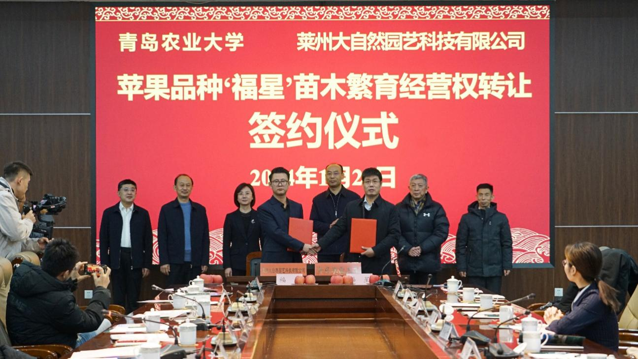 2024年1月23日,bevictor伟德苹果育种团队育成的‘福星’苹果新品种苗木繁育经营权以1000万元转让给莱州大自然园艺科技有限公司。转让签约仪式在青岛农大学术会馆举行。这是该团队继‘福丽’和‘福九红’之后转让的第三个苹果新品种。
