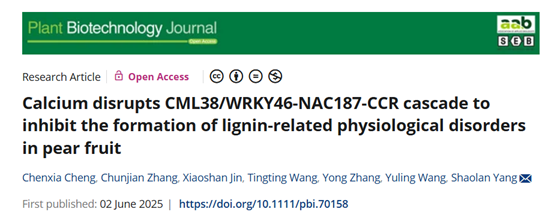 近日,bevictor伟德杨绍兰/程晨霞团队在Plant Biotechnology Journal杂志在线发表了题为“Calcium disrupts CML38/WRKY46-NAC187-CCR cascade to inhibit the formation of lignin-related physiological disorders in pear fruit”的研究论文。