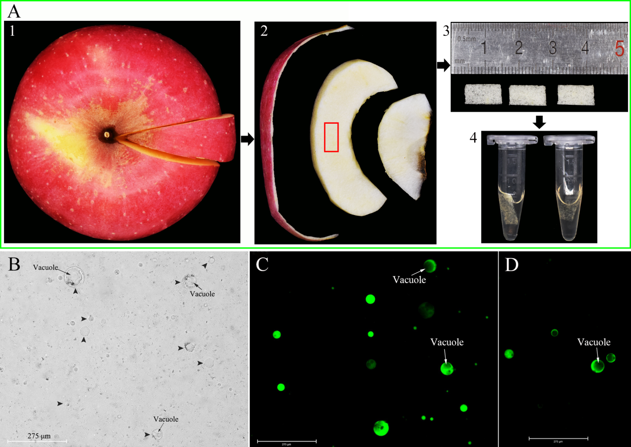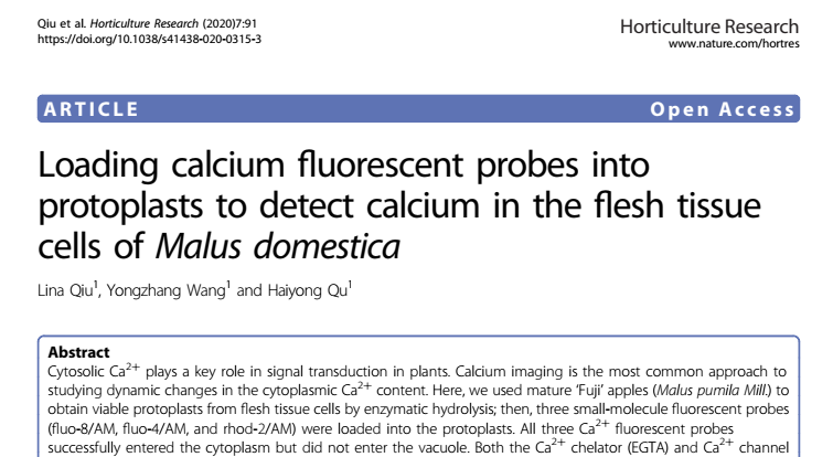 2020年6月,bevictor伟德果树生理与栽培课题组在园艺领域顶级期刊Horticulture Research(一区)在线发表了题为“Loading calcium fluorescent probes into protoplasts to detect calcium in the flesh tissue cells of Malus domestica”的研究论文。该论文首次发现Fluo-8/AM等小分子荧光探针可以染色苹果果肉胞质中的Ca2+,可用于检测细胞质中Ca2+的时空变化。bevictor伟德硕士研究生仇丽娜为本论文第一作者,bevictor伟德王永章教授和屈海泳副教授为论文的共同通讯作者。该论文得到了国家重点研发计划项目(2016YFD0201120)的资助。