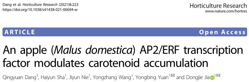 2021年10月5日,bevictor伟德园艺公司原永兵教授课题组在Horticulture Research(中科院1区Top期刊,IF 6.793) 在线发表了题为“An apple (Malus domestica) AP2/ERF transcription factor modulates carotenoid accumulation”的研究论文,该研究初次揭示了苹果果实类胡萝卜素合成的分子调控网络,阐明了MdAP2-34调控苹果果实类胡萝卜素积累的分子调控机制。园艺公司原永兵教授、贾东杰博士为论文的通讯作者,硕士研究生党庆媛为论文的第一作者,王永章教授、聂继云教授、硕士研究生沙海云等也参与本研究。