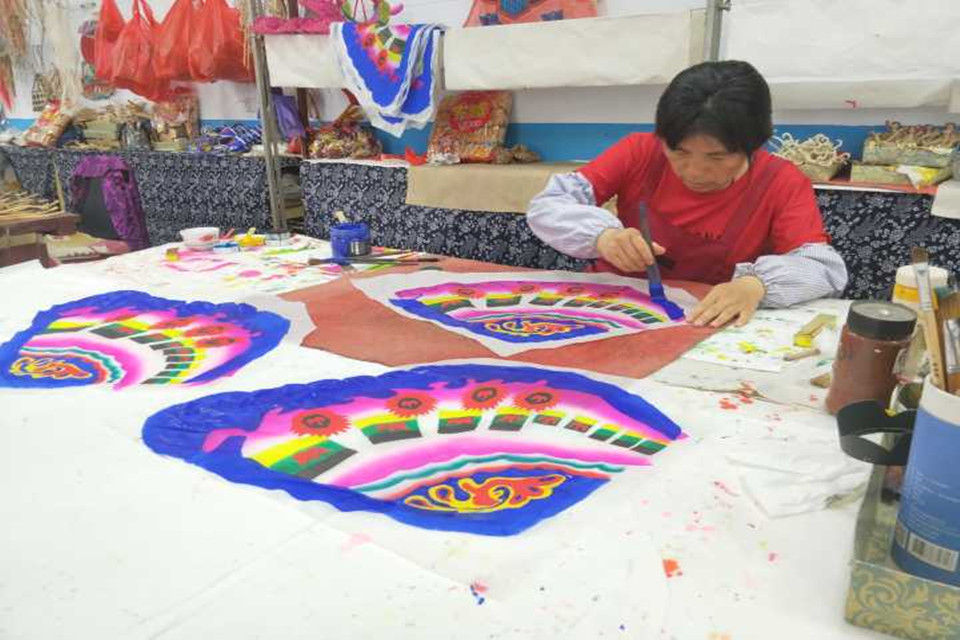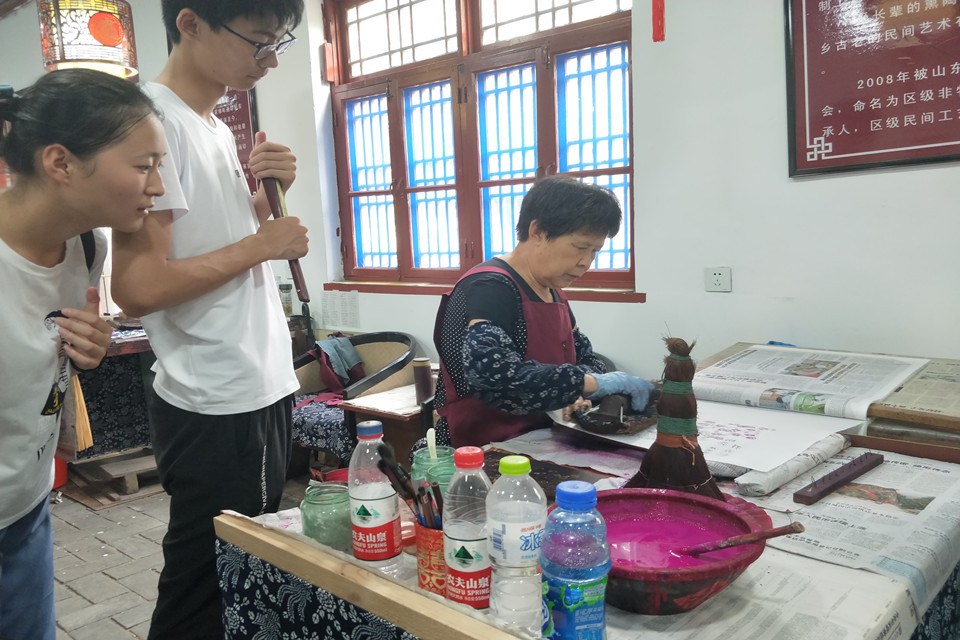 杨家埠木板年画是国家首批非物质文化遗产,以造型夸张,构图饱满,颜色鲜艳,图文并茂著称于世。杨家埠年画产于民间,源于民情,为了解杨家埠木板年画的悠久历史和制作工艺,队员们采访到了区级非物质文化遗产传承人、民间工艺大师、著名老字号画店“东义顺”的第十八世传人杨美洁老人。据老人介绍,她是从小跟她的父亲杨林福学习年画的印制,从事年画印制工艺至今已经有53个年头了。
