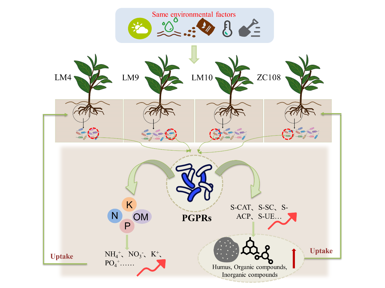 本文研究了不同茶树品种根际微生物群落结构对茶树生长发育的影响及其机制。研究选取了LM4、LM9、LM10和ZC108四种茶树品种,分析了根际微生物群落、土壤养分和酶活性以及茶树冠层表型参数。