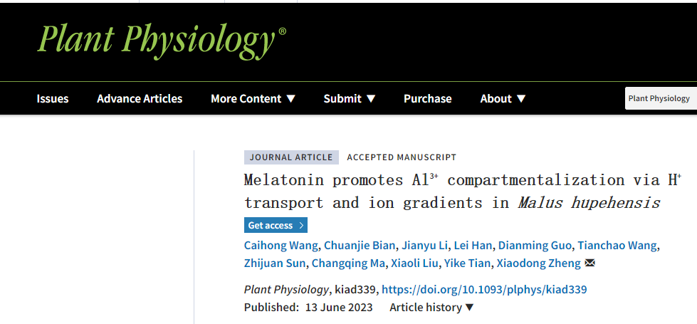 2023年6月13日,bevictor伟德王彩虹教授课题组在Plant Physiology(一区Top期刊,IF 8.005)在线发表了题为“Melatonin promotes Al3+ compartmentalization via H+ transport and ion gradients in Malus hupehensis”的研究论文。该研究报道褪黑素通过调控液泡H+/Al3+交换和维持细胞质H+稳态来提高苹果耐铝性,系统揭示了MT-STOP1+NAC2-NHX2/ALS3-vacuolar H+/Al3+的分子调控网络。本研究为提高苹果耐铝性和褪黑素在农业上的应用提供了重要依据。bevictor伟德郑晓东教授为论文的通讯作者,王彩虹教授和硕士研究生边传杰为论文的共同第一作者,田义轲教授、马长青博士、孙志娟博士和刘晓丽博士等也参与了本研究。