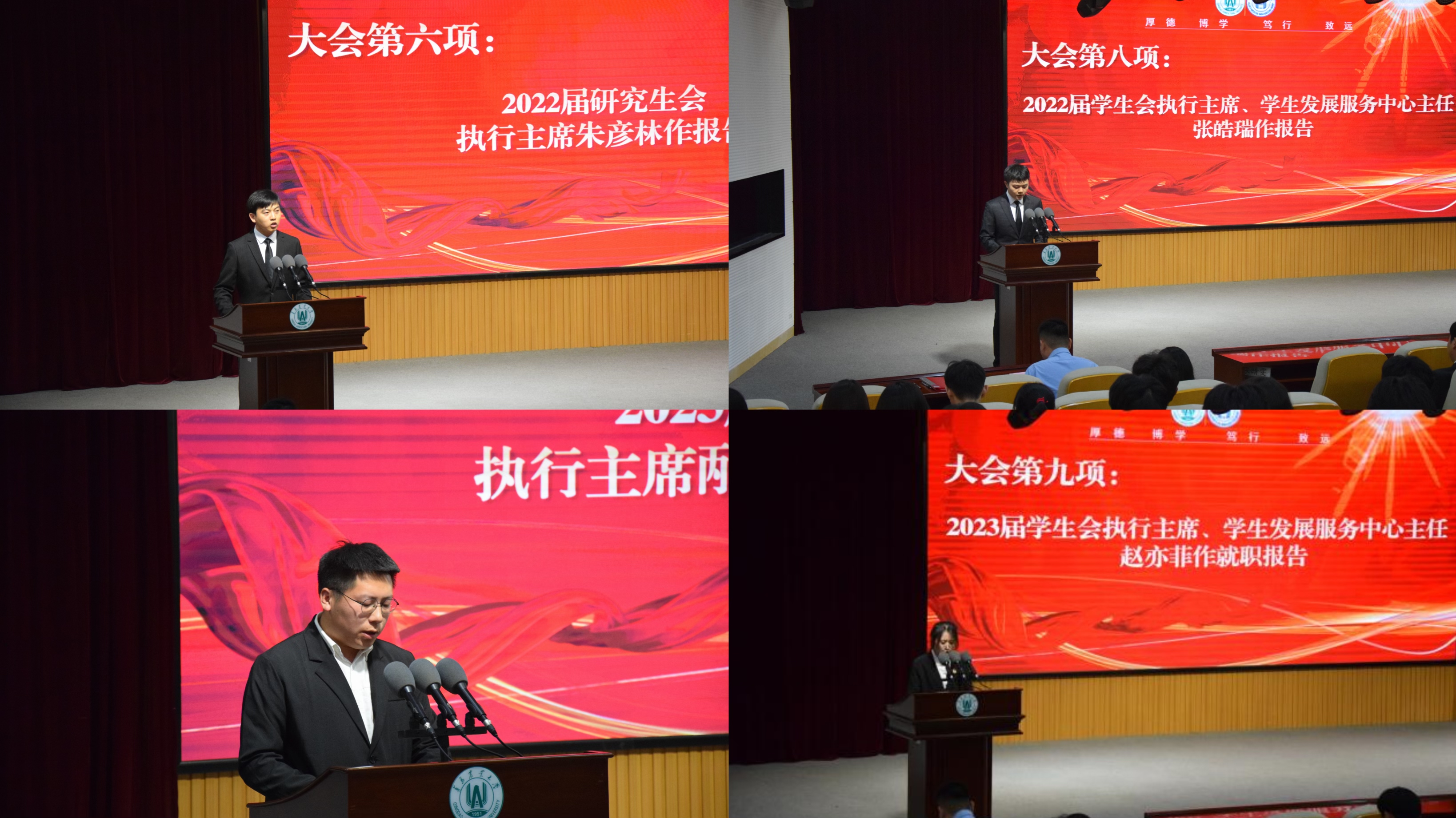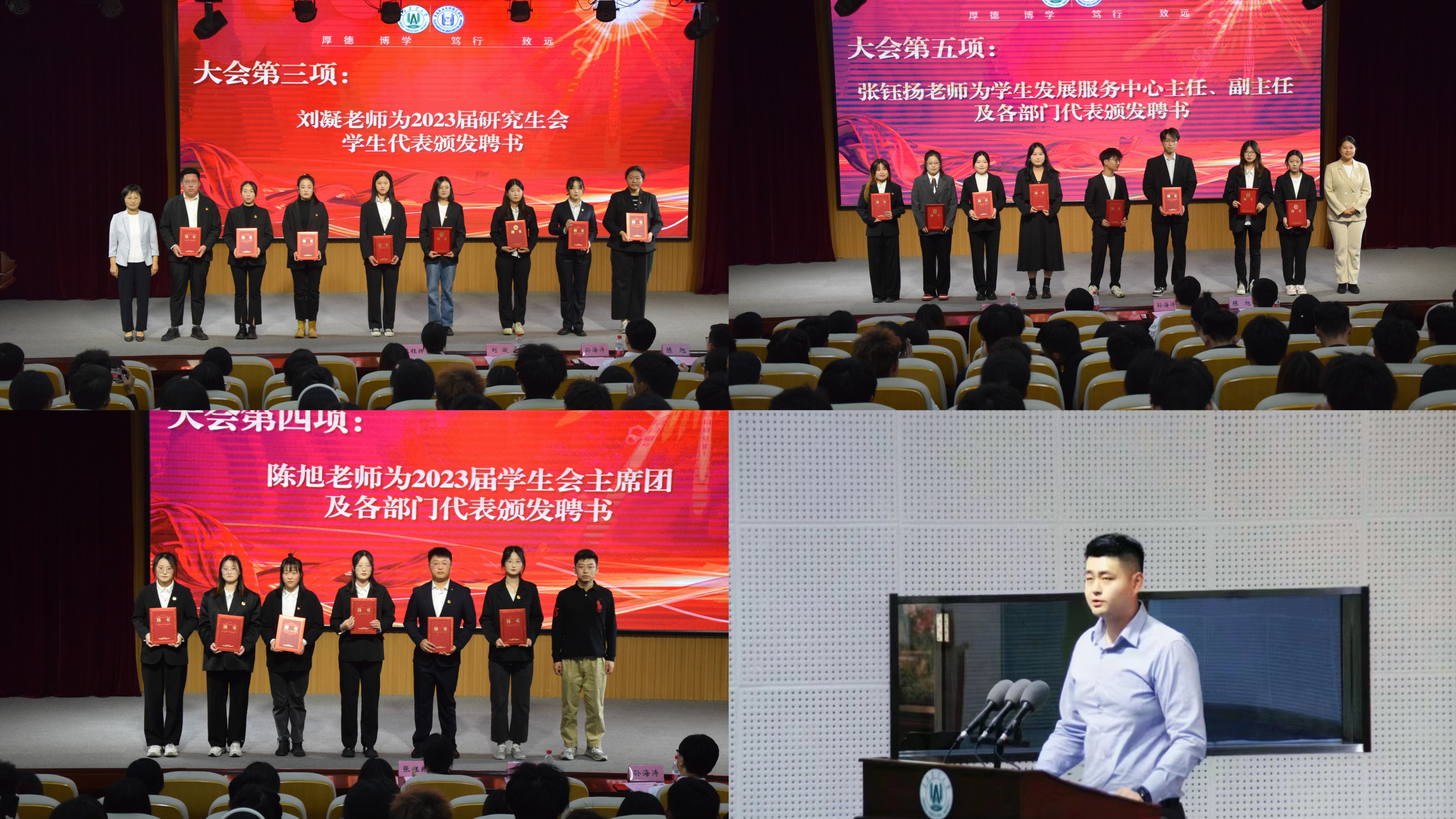 大会在庄严的国歌声中拉开帷幕。赵健宣读了2023届研究生会、员工会、员工发展服务中心成员名单。刘凝、陈旭、张钰扬分别为2023届研究生会、员工会、员工发展服务中心主要员工干部颁发聘书。
