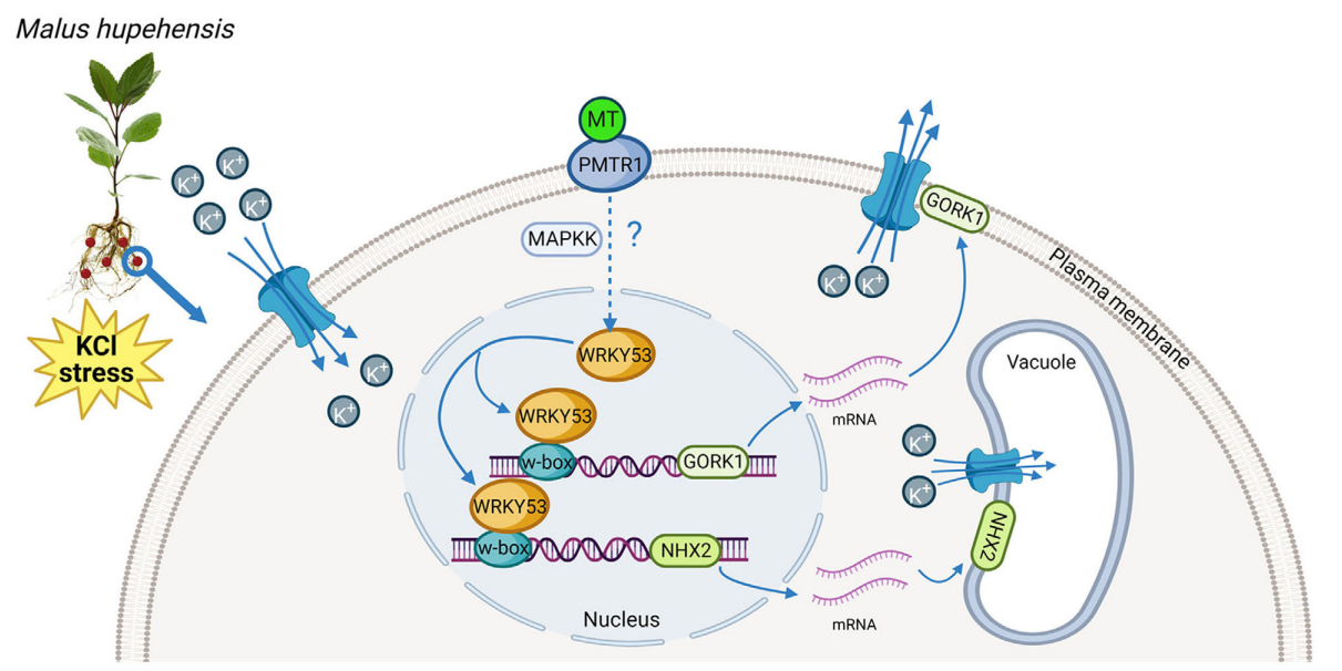 该研究中发现,外源施加褪黑素可以通过增强K+外排和促进K+进入液泡,以维持细胞K+离子稳态缓解不同苹果砧木受到的KCl胁迫。此外,还通过RNA-seq鉴定出了共同响应KCl胁迫和褪黑素处理的关键转录因子MdWRKY53。之后通过ChIP-seq、EMSA、qPCR和LUC活性检测发现MdWRKY53可以结合MdGORK1和MdNHX2的启动子并上调他们的表达,并且通过转基因试验进一步验证了MdGORK1和MdNHX2在苹果抵抗KCl胁迫时的作用,最终揭示了MT-WRKY53-GORK1/NHX2的新调控网络。