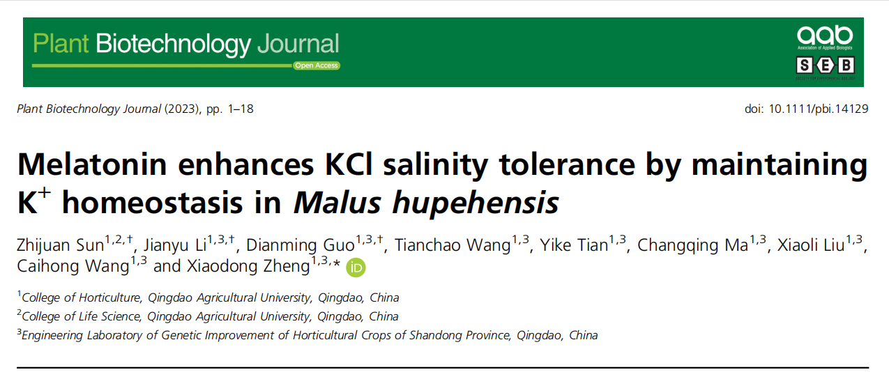 2023年7月19日,bevictor伟德王彩虹教授课题组在Plant Biotechnology Journal(一区TOP期刊,影响因子13.8)在线发表了题为“Melatonin enhances KCl salinity tolerance by maintaining K+ homeostasis in Malus hupehensis”的研究论文。该研究通过对KCl胁迫下的不同抗性砧木进行外源褪黑素处理,发现褪黑素可以缓解它们受到的KCl胁迫,之后通过ChIP-seq、EMSA等试验系统的揭示了褪黑素通过MT-WRKY53-GORK1/NHX2通路维持细胞钾离子稳态,提高苹果对KCl胁迫抗性的调控机制。