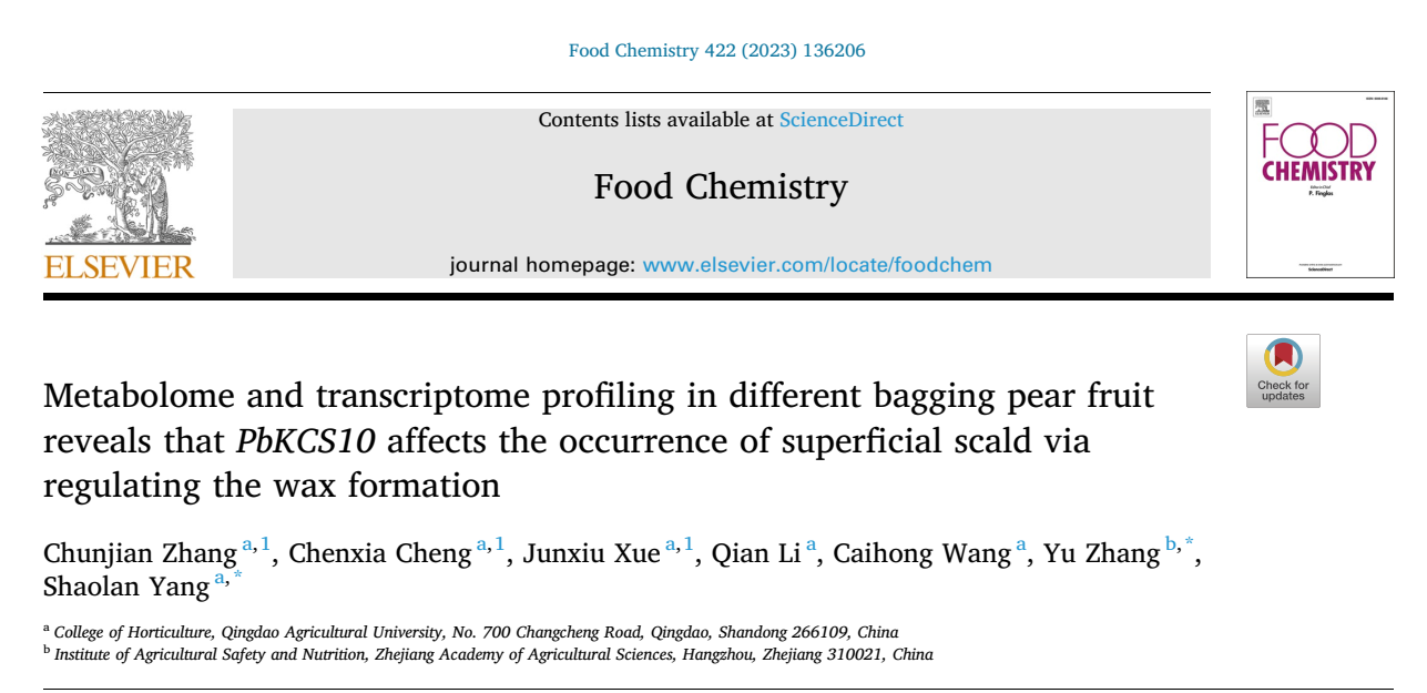 2023年4月25日,bevictor伟德园艺植物采后工程与技术团队团队在Food Chemistry(中科院1区Top期刊,IF 9.231)在线发表了题为“Metabolome and transcriptome profiling in different bagging pear fruit reveals that PbKCS10 affects the occurrence of superficial scald via regulating the wax formation”的研究论文,揭示了梨果皮蜡质合成抑制虎皮病发生的机制。